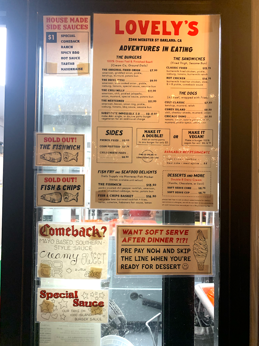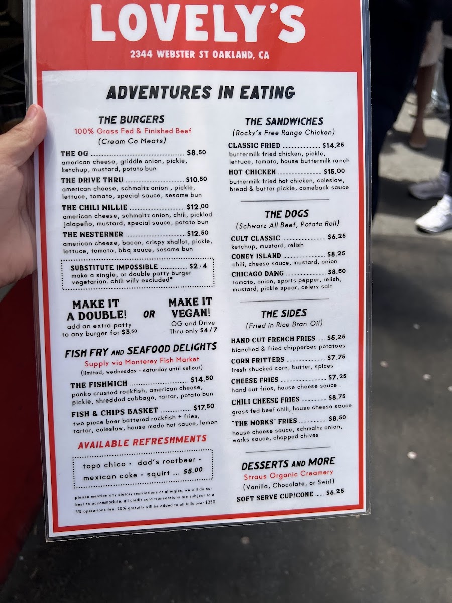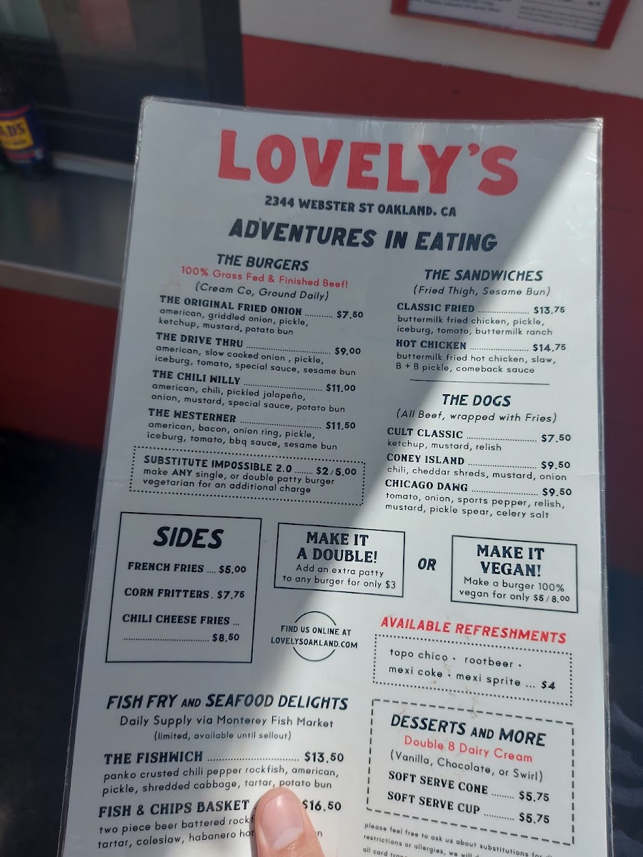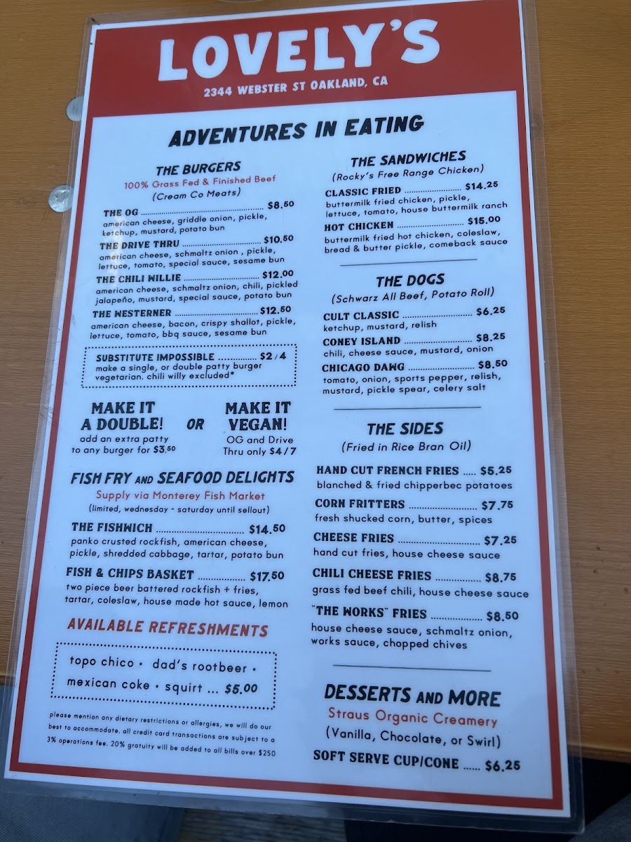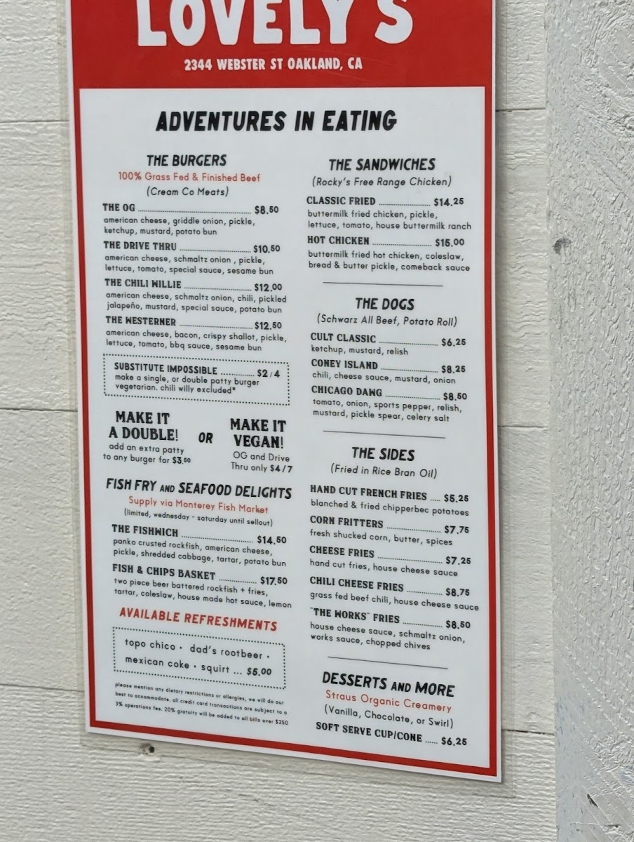 Welcome to Lovely’s, a delightful culinary gem nestled in Oakland, CA, offering a menu that celebrates bold flavors and hearty comfort food. Known for its smash burgers, the restaurant excels with options like the Chili Cheese Burger, featuring a medley of chili, cheese, and pickled jalapeños, and the Fried Chicken Sandwich, served with fresh lettuce and tomato.